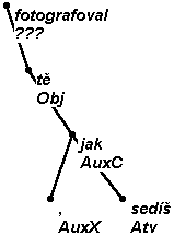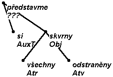The construction Jan vstoupil hlavu skloněnou/skloněnu (John entered, his head inclined) expresses dependence on the action (how did he enter?) and, at the same time, traditionally it is understood to depend on the name Jan, due to its agreement with this noun. Šmilauer speaks about “absolute accusative of property” pointing out that here the transgressive (maje, majíc, majíce - having) is elided, and classes these constructions with complement. We, however, miss an element that would make it possible to render exactly syntactic relations in the tree (the absent transgressive). Therefore we describe this type with the aid of afun ExD (see Ellipsis ExD, ExD_Co).