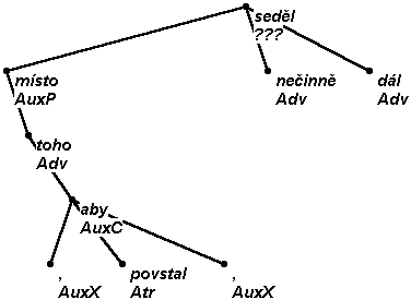 Loosely attached sentence members ( Freely adjoined sentence parts is devoted to them) are, as a rule, introduced by particles a to, a sice, a (i.e., viz., or (else)). The loosely attached sentence members (there is mostly just one, but more of them can be present as well) obtain their current afun, the placement of the particles and of comma can be seen in the examples. Commas depend on the outermost members like parenthetic punctuation (described in the part Bracketing AuxG). The particles which obtain afun AuxY depend on the first member and in case they consist of two nodes, the first node of the particle depends on the second.