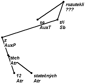 The most important for the purpose of our annotation judgements is the third type of classification quoted above. Actual ellipsis is captured by the afun ExD, while with a lexicalized ellipsis this afun is not used, since we do not feel it as a deletion at all. For the reasons of consistency, the sentence members syntactically dependent on the deleted word (which technically is suspended at the very position in which the deleted word would be suspended) are assigned either that function the word would have if nothing were deleted (jít go in ex. (1)), or the function of the deleted word (hodiny o'clock in ex. (2)). An actual ellipsis occurs only in the given context, it is not connected with any fixed expression. The sentence members depending on the deleted word are assigned ExD and are suspended in the place where the deleted member would be placed (the second occurrence of obce villages in ex. (3).