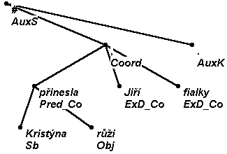 An exception to this rule are prepositions and subordinate conjunctions which get AuxP or AuxC, and the afun ExD “falls down” to the node that depends on them (and that constitutes a sentence member). A similar situation obtains with constructions with coordination and apposition, when ExD is shifted below, to the individual members of coordination or apposition, which are then marked as ExD_Co or ExD_Ap; the governing node of coordination or apposition keeps its afun Coord or Apos.