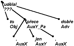 The list of potential AuxY_Pa: aby, ať, ať už, bohudík, bohužel, jasně, kdyby, kupodivu, možná, naopak, například, nicméně, nuže, opravdu, ostatně, patrně, pravděpodobně, prostě, prý, přece jen, samozřejmě, snad, stejně, tedy, totiž, věru, vlastně, však, zřejmě, že